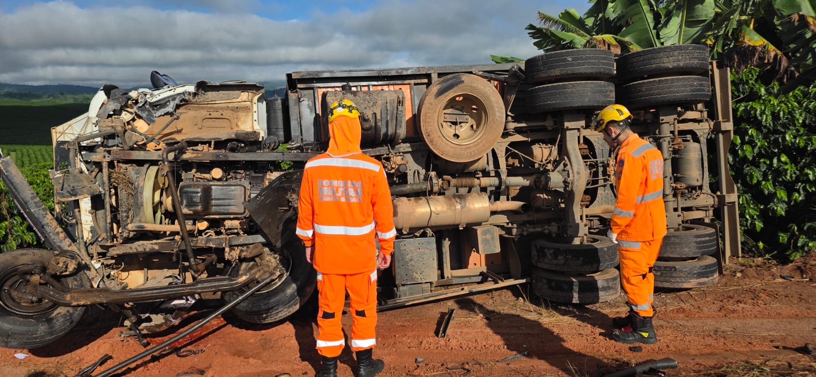 A colisão frontal ocorreu quando o caminhão seguia no sentido Machado, enquanto o automóvel trafegava na direção oposta. Com a força do impacto, o carro capotou, e o condutor — um homem de 35 anos, que estava sozinho no veículo — foi ejetado para fora da cabine.