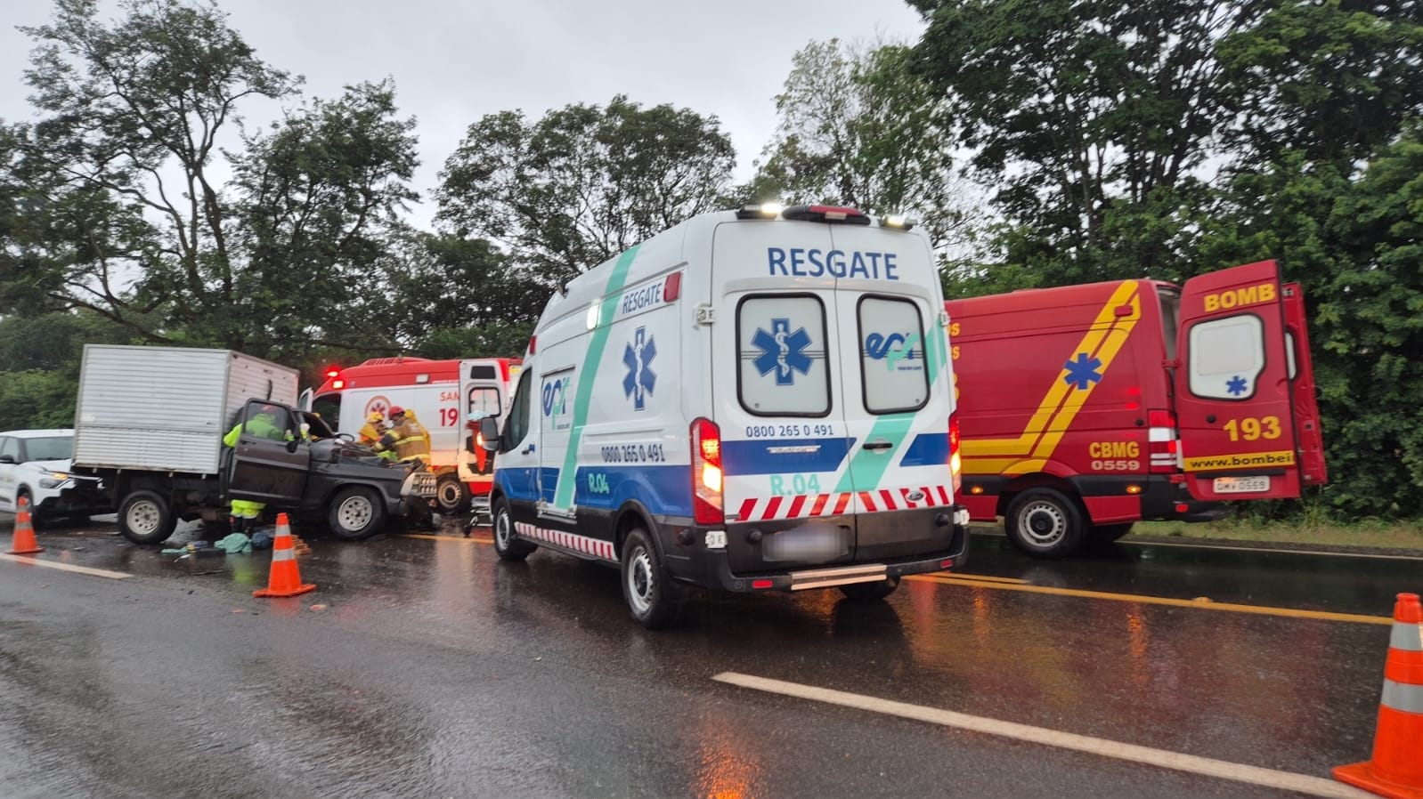 De acordo com o Corpo de Bombeiros da 3ª Companhia, as guarnições de resgate e salvamento foram acionadas por volta das 7h21 para atender a ocorrência, que envolveu uma colisão frontal entre uma caminhonete e um caminhão. Com o impacto, um terceiro veículo que passava pelo local acabou colidindo na traseira da caminhonete.