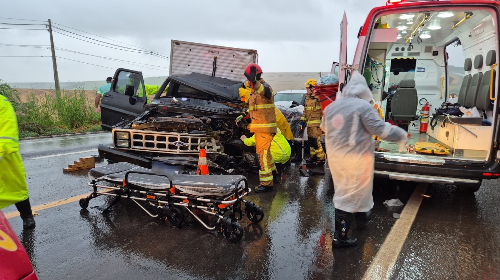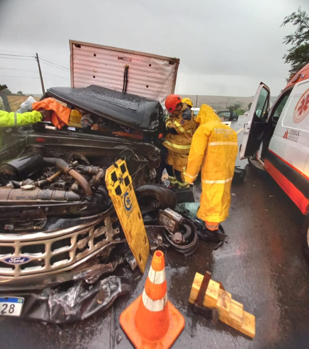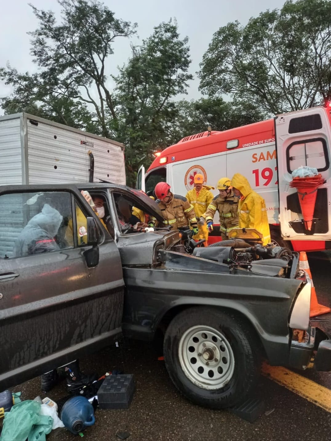 O motorista da caminhonete, um homem de 40 anos, ficou preso às ferragens. Ele estava consciente e orientado, mas apresentava fratura completa na perna esquerda e fratura no braço esquerdo.