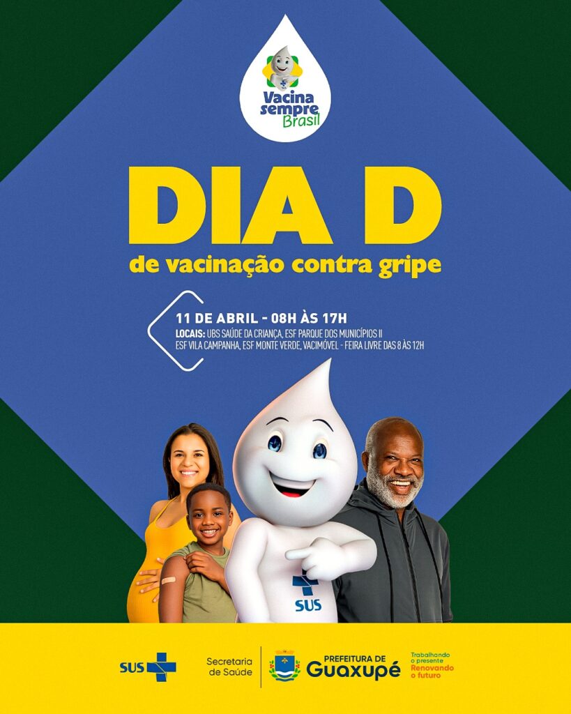 A Prefeitura de Guaxupé convoca a população dos grupos prioritários para participar do Dia D de Vacinação contra a Influenza, que será realizado no dia 11 de abril de 2026, das 8h às 17h.