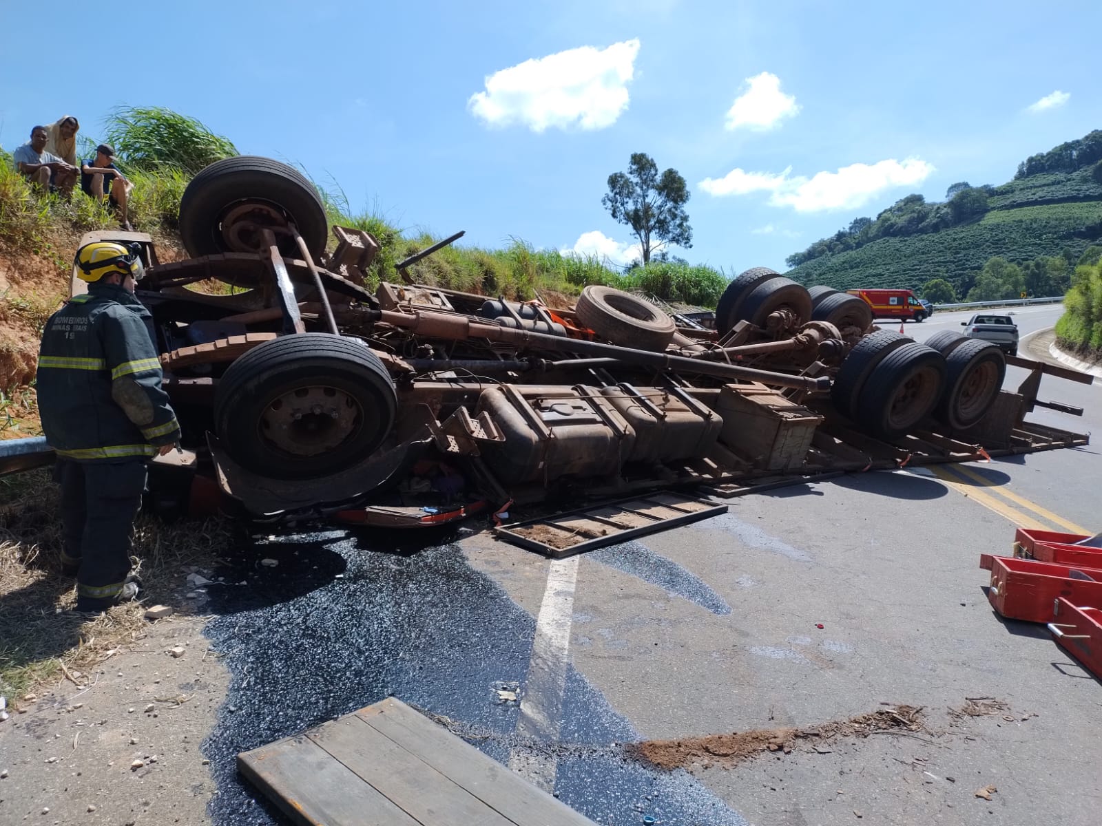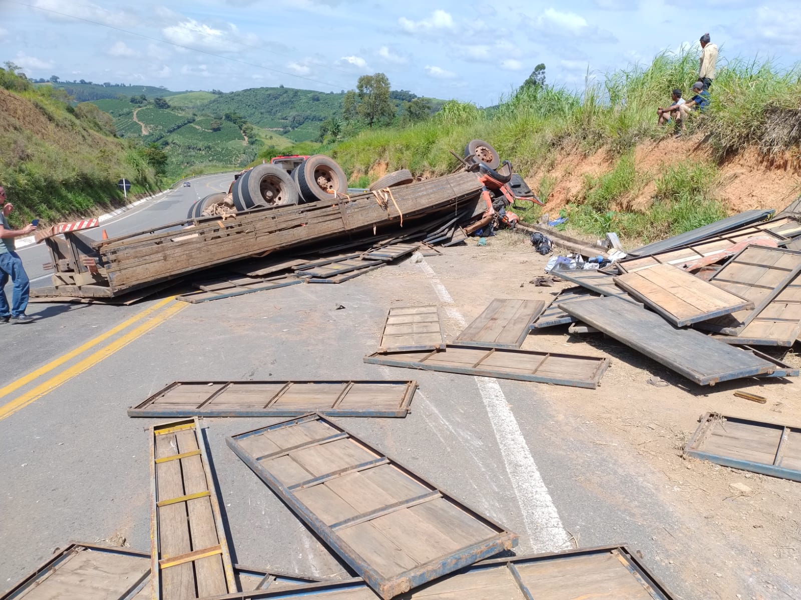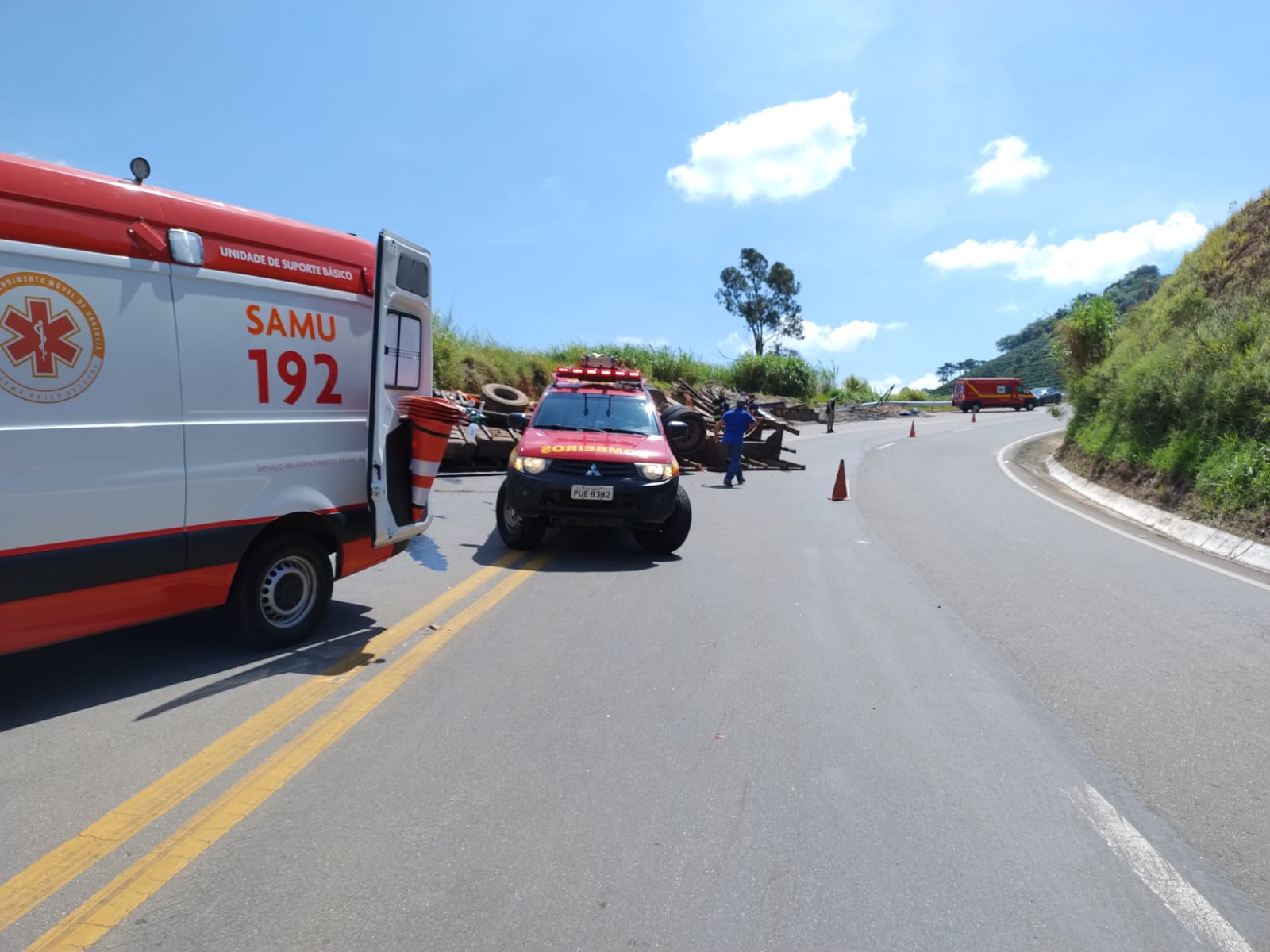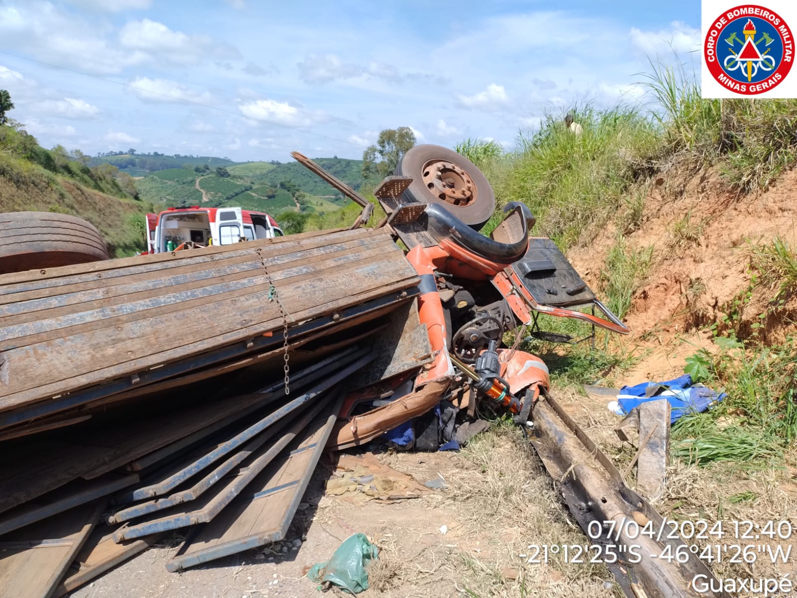 O sinistro de trânsito ocorreu por volta das 12h do domingo, 7, em um trecho da BR 146 bastante conhecido pelo número de acidentes que ocorre no local: a “Serrinha”, próximo ao radar no trecho que liga São Pedro da União a Guaxupé. O condutor (morador de Franca/ SP) de uma carreta com placa de Jacuí, por causas ainda a serem esclarecidas em perícia técnica da Polícia Civil, perdeu o controle do seu veículo que estava carregado com estruras para montagem de rodeio, vindo a capotar. A carga ficou espalhada na borda lateral da pista. O condutor que estava só no caminhão ficou preso sob a cabine do veículo e faleceu no local tendo seu óbito constatado pelo médico de uma equipe de Suporte Avançado de Vida do SAMU de Guaxupé. A Equipe de Salvamento Terrestre e resgate do 2º Pelotão de Bombeiros ainda permanece no local aguardando a chegada de um guincho para fazer a remoção das estruturas e assim liberar o corpo que está embaixo do caminhão para providências fúnebres. Ainda não foi possível identificar o ponto de saída e destino da carreta, nem de onde era o condutor. A Polícia Militar esteve no local para apoio nas providências quanto ao trânsito e veículos.