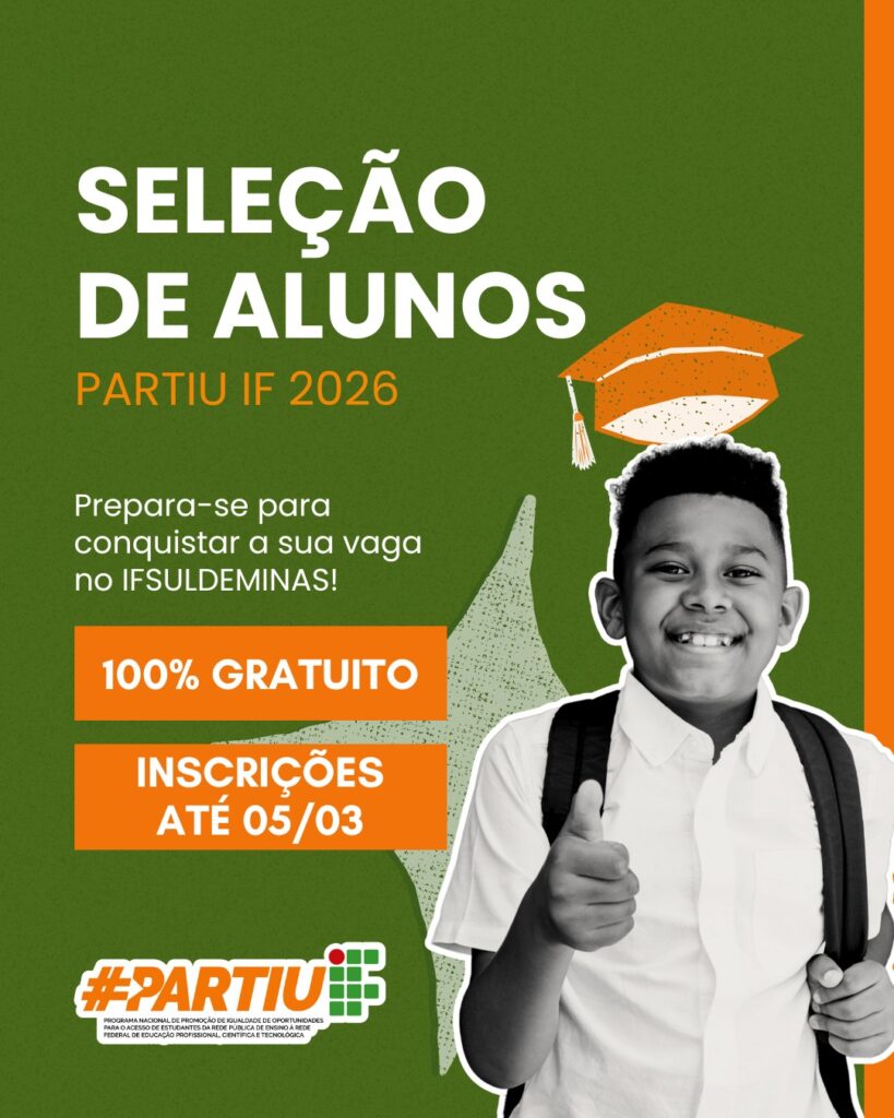 O Instituto Federal do Sul de Minas Gerais (IFSULDEMINAS) está com inscrições abertas para a Seleção de Estudantes do Programa Partiu IF 2026. O cursinho é totalmente gratuito e tem como objetivo reforçar a aprendizagem de estudantes do 9º ano do ensino fundamental, ampliando as chances de acesso ao ensino médio integrado ao técnico em instituições públicas, como o próprio IFSULDEMINAS.