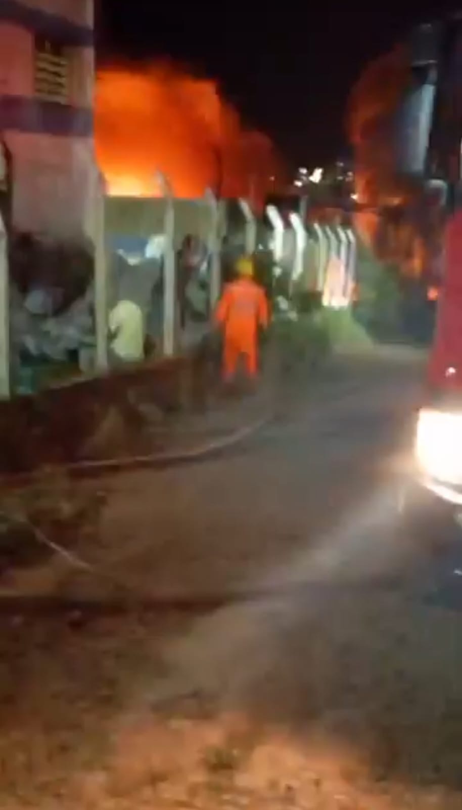 Tratava-se de um incêndio envolvendo grande quantidade de bags de polipropileno. No interior do galpão havia um compressor, uma cozinha com botijão de gás e uma área de produção com máquinas e equipamentos.