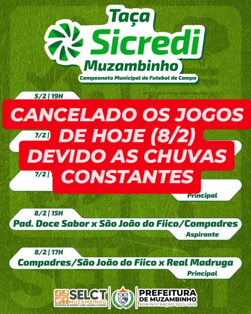 A Secretaria de Esporte, Lazer, Cultura e Turismo informa que os jogos do Campeonato Municipal de Futebol de Campo de Muzambinho, previstos para esta rodada, foram cancelados em razão das intensas chuvas, que comprometeram as condições do gramado e a segurança dos atletas.
