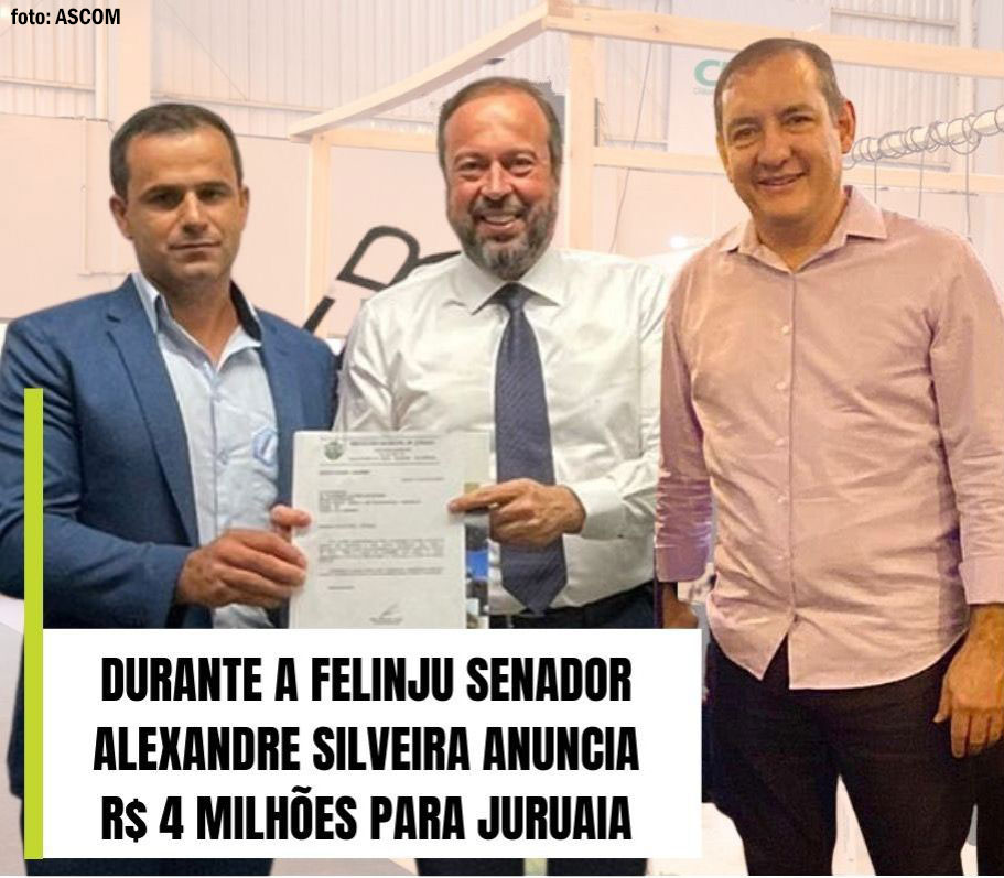 Na companhia do ex-deputado federal Renato Andrade, durante sua visita em Juruaia, o Senador da República Alexandre Silveira, que foi também patrono da 25º FELINJU, anunciou emenda parlamentar no valor de R$ 4 milhões para o município, que serão investidos nas obras do asfalto que liga Juruaia ao Distrito Mata do Sino.