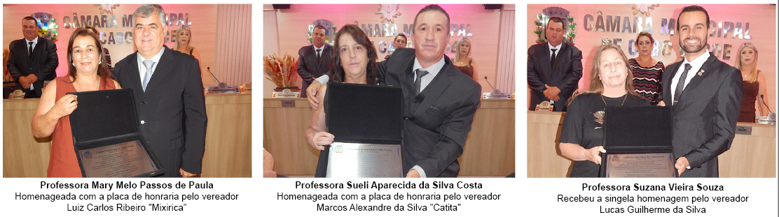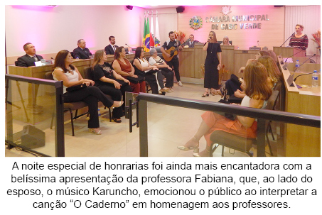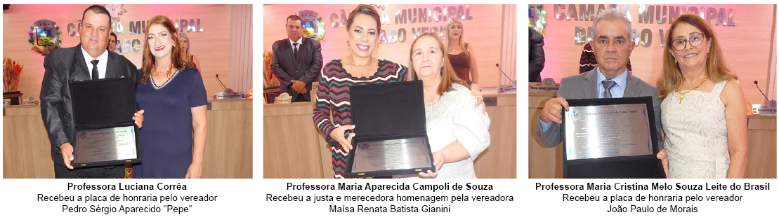 Celebrando o Mês do Professor, a Câmara Municipal realizou, na segunda-feira (13/10), uma bela e emocionante solenidade com a entrega da honraria “Medalha Professora JANE RENATA CONGIO REIS”. Durante a reunião solene, educadoras indicadas pelos vereadores, com mais de 25 anos de dedicação e compromisso com a educação no município, receberam a honraria.