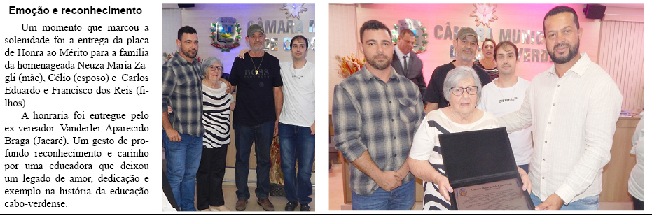 A homenagem, criada pela Resolução nº 05 de 07 de maio de 2024, de autoria do ex-vereador Vanderlei Aparecido Braga, presta tributo à inesquecível Professora Jane Renata Congio Reis (in memoriam), exemplo de amor, ética e vocação pelo ensino e que deixou um legado inspirador no cenário educacional e no Poder Legislativo.