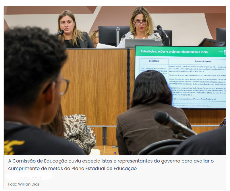 As informações foram apresentadas em audiência pública da Comissão de Educação, Ciência e Tecnologia da Assembleia Legislativa de Minas Gerais (ALMG) na quinta-feira (23/4/26). A pedido da presidenta, deputada Beatriz Cerqueira (PT), a comissão realiza uma série de reuniões para avaliar o cumprimento das metas do PEE.