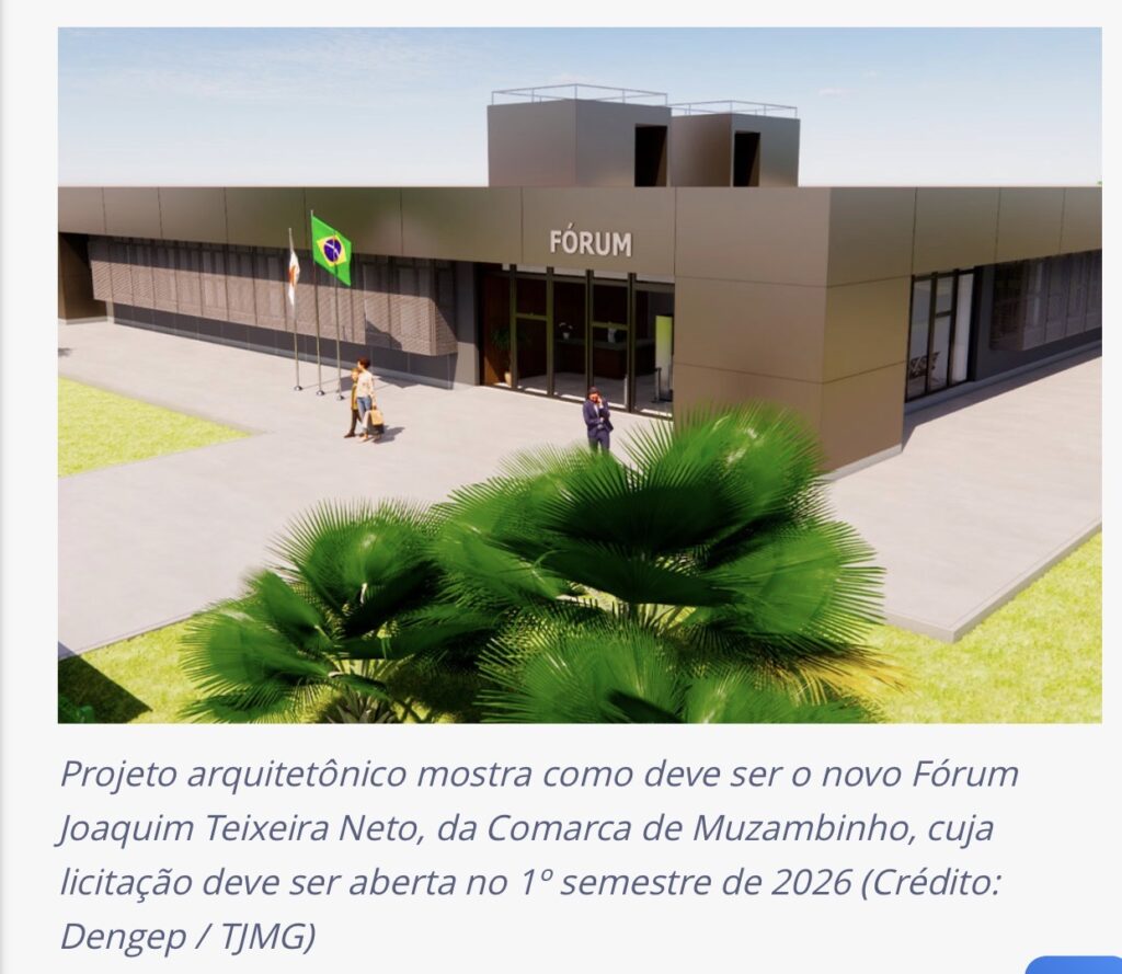 A Comarca de Muzambinho, na região Sul do Estado, ganhará, nos próximos anos, uma nova sede do Fórum Joaquim Teixeira Neto. O Tribunal de Justiça de Minas Gerais (TJMG), por meio da Diretoria Executiva de Engenharia e Gestão Predial (Dengep), deve abrir a licitação para a construção da nova unidade ainda no 1º semestre deste ano.