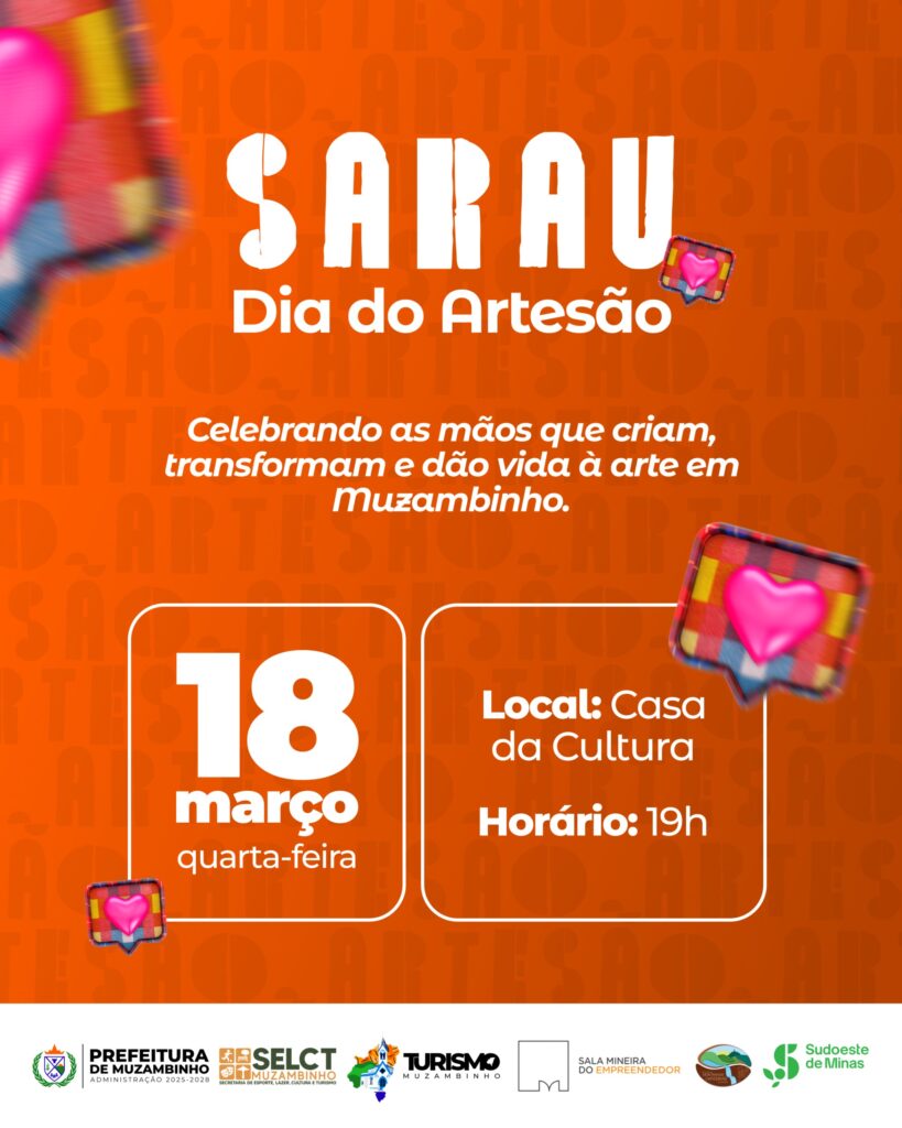 A Prefeitura de Muzambinho realiza, nesta quarta-feira (18), um sarau especial em comemoração ao Dia do Artesão. O evento, organizado pela Secretaria de Esportes, Lazer, Cultura e Turismo em parceria com a Sala Mineira do Empreendedor, será realizado às 19h, na Casa da Cultura.