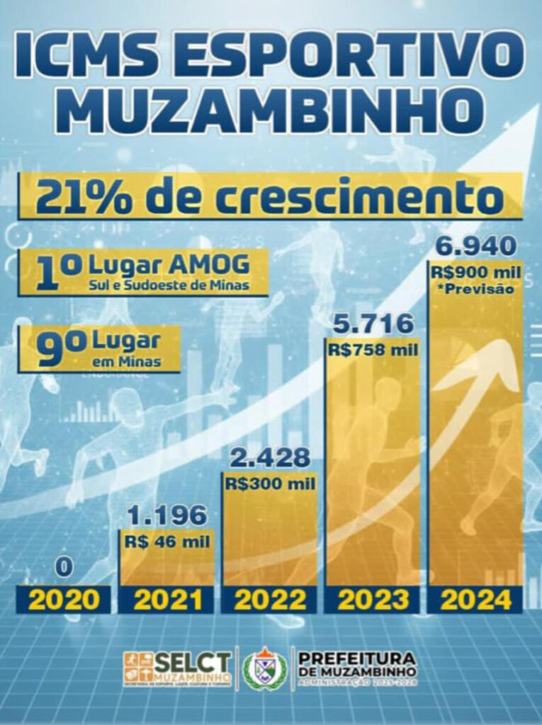 Muzambinho vem se consolidando como referência regional em políticas públicas voltadas ao esporte. Dados do ICMS Esportivo mostram que o município registrou crescimento de 21%, alcançando posições de destaque tanto em Minas Gerais quanto na região Sul e Sudoeste do Estado.