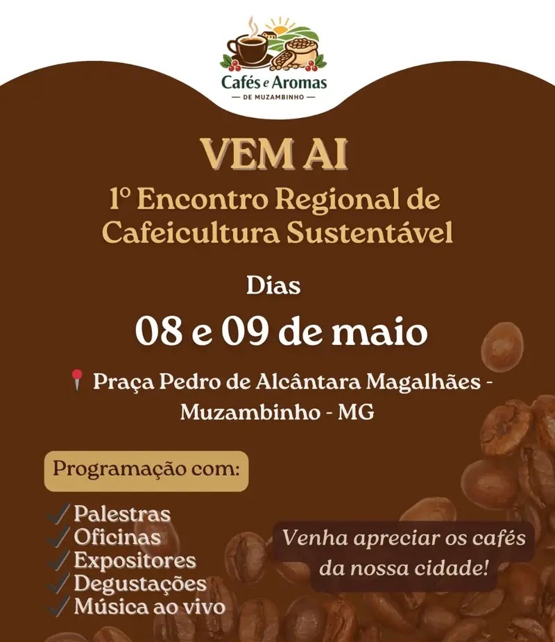 A cidade de Muzambinho receberá, nos dias 8 e 9 de maio, o 1º Encontro Regional de Cafeicultura Sustentável. O evento será realizado na Praça Pedro de Alcântara Magalhães e promete reunir produtores, especialistas, estudantes e apreciadores do café em uma programação voltada à valorização da produção local e às práticas sustentáveis no setor.