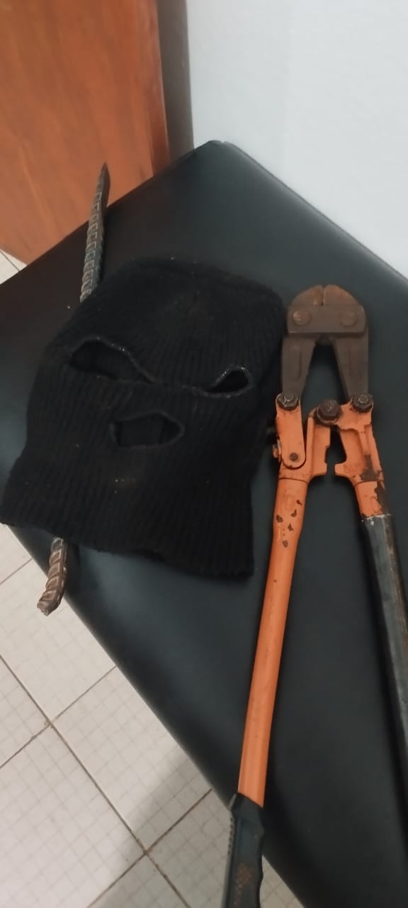 A guarnição iniciou rastreamento e conseguiu localizar o veículo, já abandonado e no seu interior vestes e ferramentas que poderiam ser usadas na prática de crimes, sendo: