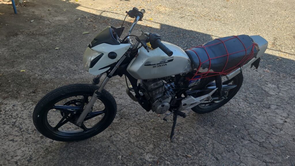 Durante interrogatório do preso pelo roubo, ele indicou que a motocicleta utilizada no crime estava na residência de um vizinho. No local, foi verificado que a moto apresentava sinais de adulteração, e o proprietário do imóvel onde o veículo estava guardado recebeu voz de prisão por receptação.