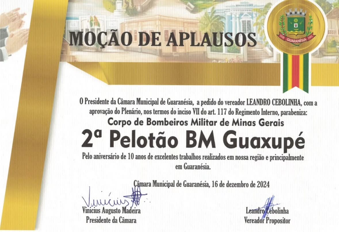 O 2º Pelotão BM recebeu da Câmara Municipal de Guaranesia uma Moção de Aplausos proposta pelo Vereador Leandro Cebolinha, parabenizando pelo aniversário de 10 anos. O ato de entrega do certificado ao Comandante do 2º Pelotão BM de Guaxupé, Ten Pereira, foi acompanhado pelo Assessor do Deputado Federal Lincoln Portela e Deputada Estadual Alê Portela, Sr. Márcio Nobre, juntamente com o Sr Eduardo.