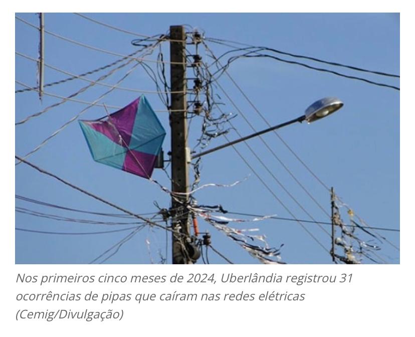 Nos primeiros cinco meses de 2024, Uberlândia registrou 31 ocorrências de pipas que caíram nas redes elétricas, afetando mais de 9 mil moradores. Os dados são da Companhia Energética de Minas Gerais (Cemig). O técnico de segurança do trabalho da Cemig, Iracy José Jerônimo, explicou que os principais riscos são acidentes com pessoas tentando retirar pipas presas à rede elétrica e curto-circuitos causados pelas linhas, que podem romper cabos e energizar locais, resultando em acidentes graves. Em 2023, o município totalizou 124 casos de pipas em redes elétricas e mais de 18 mil consumidores foram prejudicados. (Diário de Uberlândia)