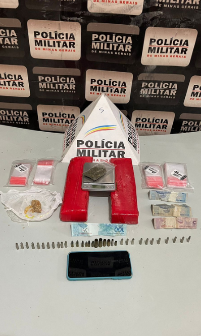 A Polícia Militar prendeu um indivíduo suspeito de tráfico de drogas em Muzambinho na madrugada de sexta-feira (16) apreendendo um vasto material ilícito. A operação resultou na detenção do indivíduo e na apreensão de substâncias entorpecentes, dinheiro em espécie e possíveis objetos relacionados ao comércio ilegal de drogas. A ação é parte dos esforços das autoridades para combater o tráfico e garantir a segurança na região. A prisão foi realizada após uma investigação cuidadosa e monitoramento das atividades suspeitas.