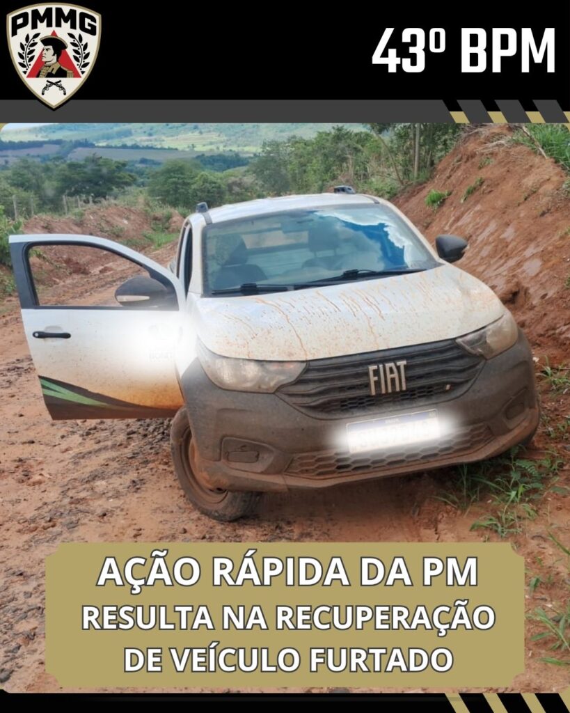 Após a vítima relatar o desaparecimento de sua caminhonete Fiat Strada, furtada nas proximidades de um hotel na Avenida Ângelo Calafiori, as equipes do 43º BPM iniciaram rastreamento imediato. Após diligências, o veículo foi localizado em uma estrada vicinal, abandonado e com sinais da tentativa de fuga. No interior, os militares encontraram uma munição calibre .38 e pertences deixados pelos autores, elementos importantes para as investigações futuras.