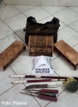 Durante a abordagem foram encontrados 07 pássaros da fauna silvestre, conhecidos como “trinca-ferro” ou “Picharro”, armazenados em 03 gaiolas e diversos materiais utilizados para a caça.