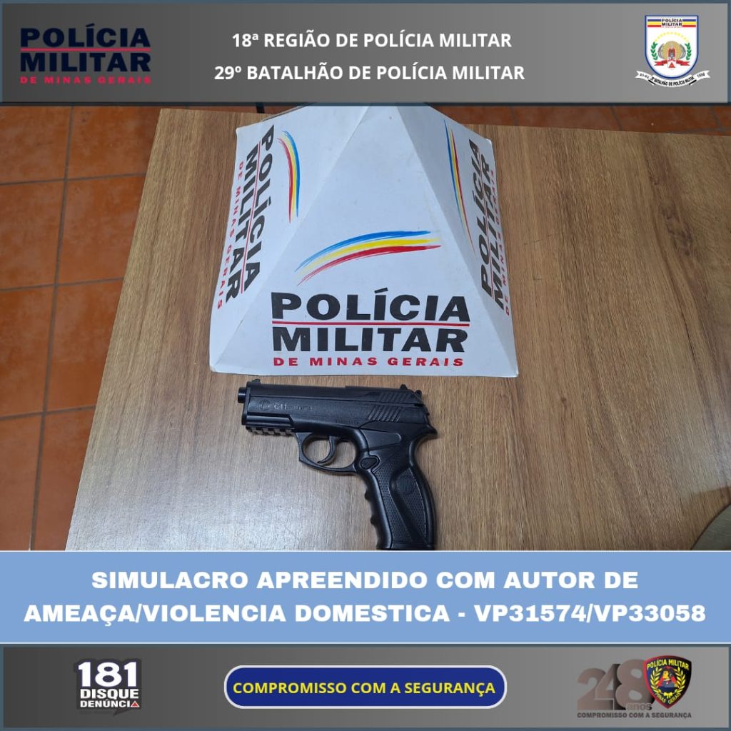 Em 12 de fevereiro, às 23h51min, na cidade de Poços de Caldas, a Polícia Militar foi acionada e compareceu à Rua Dalva de Oliveira, bairro Estância São José, onde efetuou contato com a vítima, sexo feminino, 52 anos, que se apresentou abalada emocionalmente e chorosa. Ela relatou que foi vítima de agressão e ameaça por seu ex namorado e vizinho e que este teria utilizado uma arma de fogo, apontando para sua testa e disse que iria matá-la. Em contato com o autor, sexo masculino, 51 anos, acompanhado, ele relatou que a vítima foi à residência dele e atirou pedras no telhado e portas da casa, com constatação da equipe policial de um vidro da porta quebrado. Em razão da embriaguez de ambos os envolvidos, que estavam com os ânimos exaltados, foi solicitado apoio policial. Bastante exaltado e nervoso, o autor passou a criticar a atuação da equipe policial, pelo que foi necessário contê-lo e algemá-lo, para garantir a integridade física da equipe. A namorada do autor franqueou a entrada dos policiais na casa, onde foi encontrado um simulacro, (Pistola de AIRSOFT marca C11 C02PISTOL) na cor preta, que foi reconhecido pela vítima como sendo a arma empregada na ameaça. O autor negou ter algum relacionamento afetivo com a vítima. Ele foi preso, encaminhado à UPA e posteriormente encaminhado à Delegacia de Polícia Civil, com a arma de fogo/simulacro que foi apreendida. A vítima também foi encaminhada à UPA, devido ao seu estado emocional.