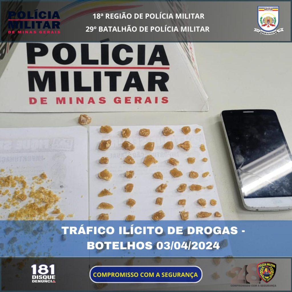 No dia 03 de abril, às 18h25min, na cidade de Botelhos-MG, a Polícia Militar a Polícia Militar foi acionada para verificar denúncia recebeu denúncias de que dois homens, de 34 e 33 anos buscaram certa quantidade de crack no Bairro Jardim Eldorado e levavam o material ilícito para o Bairro Santa Cruz, onde iriam porcionar para vender. Em rastreamento aos suspeitos, a equipe policial deparou com dois na Rua Prof. Edmundo Profilli e durante busca pessoal localizou em posse deles 66 pedras de crack, 01 porção esfarelada de crack, 01 pedra grande de crack e 01 aparelho de telefone celular. Os autores foram presos, conduzidos à unidade de saúde, para comprovar a integridade física e posteriormente levados à 2ª Central Estadual do Plantão Digital/SIPJ, de Poços de Caldas-MG, com o material apreendido.
