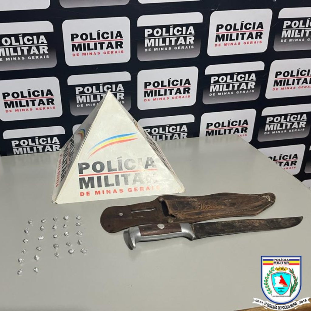 Houve uma denúncia sobre um indivíduo que estaria comercializando entorpecentes naquele local. De posse das informações, a equipe policial localizou o indivíduo, de 51 anos, que tinha dentro de sua mochila 26 pedras de substância análoga a Crack e uma faca de 22 cm de lâmina, aproximadamente.