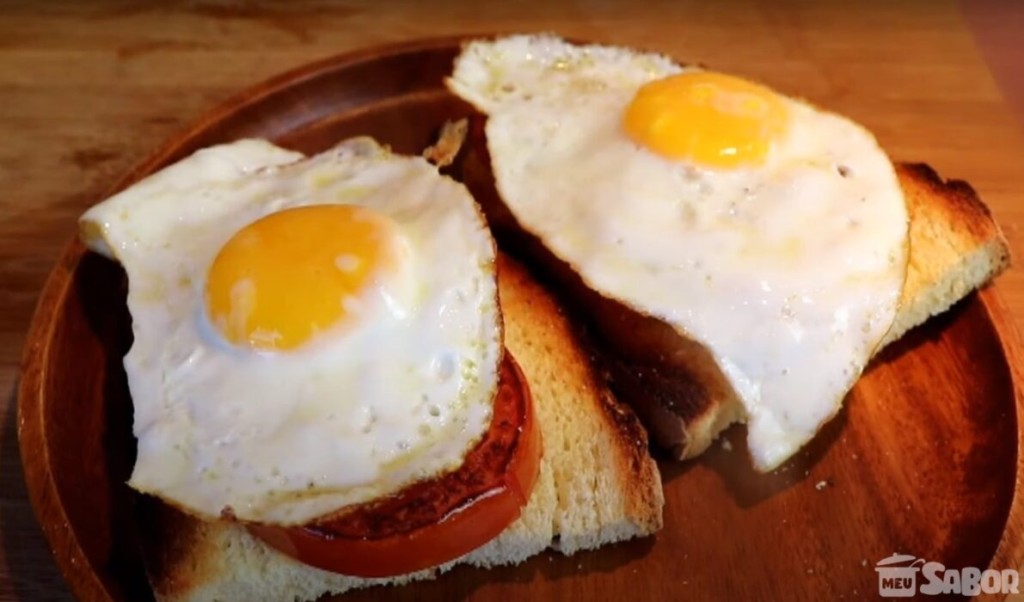 - Coloque o tomate sobre o pão, logo acima coloque o ovo e tempere com sal e pimenta-do-reino.