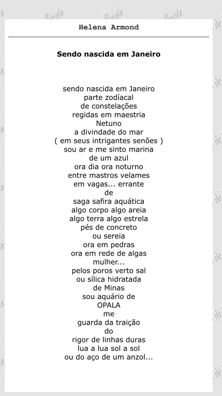 Helena foi uma artista multidimensional (pintora, escultora, poetisa e pesquisadora). Era mutável e inesperada, um “aquário de opoca”, como ela mesmo se define, e também uma inconformista, dotada de rebeldia artístico-existencial, capaz de surpreendentes voos solo: “Não vendo/ mel/ ou melado/ nem manjares/ vendo/ pimentas/ que/ abrem bocas/ que babam”. Ou, então: “sigo a trilha do tigre/ ando no fio na navalha/ convivo com deuses ferozes/ entendo cada canalha”. Ou, ainda, quando busca uma fórmula perfeita para forjar um verbo: “Quando/ falo/ de/ fogo/ verbo/ se/ faz forma (…) num fogo/ ad náusea/ queimo proposições/ em decomposições/ das palavras”. No seu cantochão, “o pranto é água benta”, e parece elevar-se aos ares, ao mesmo tempo denso e fluído, sonoro e frágil, trágico e inescrutável, lembrando, por vezes, uma oração, atemporal, a alguma deusa antiga, distante.