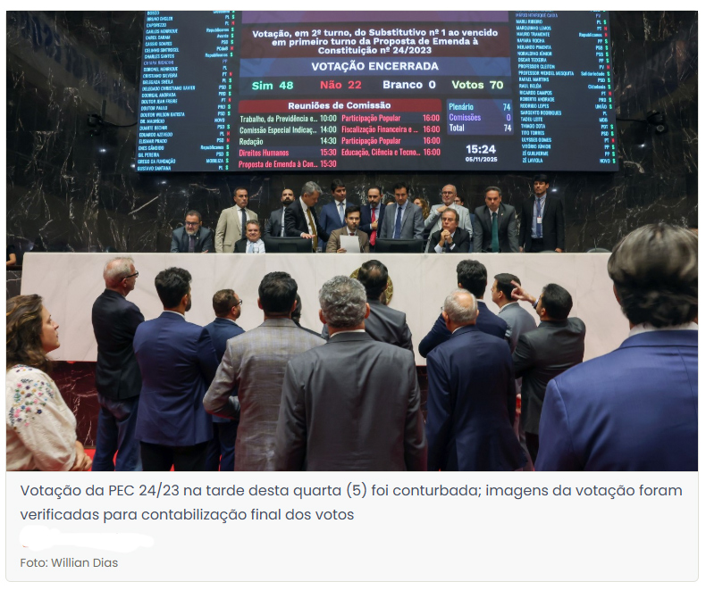 Em uma votação conturbada, em que o placar final foi contestado pela oposição e que incluiu consultas da Mesa às imagens gravadas do Plenário da Assembleia Legislativa de Minas Gerais (ALMG) para confirmação do resultado, foi aprovada em definitivo (2º turno), na quarta-feira (5/11/25), a Proposta de Emenda à Constituição (PEC) 24/23, que tem o objetivo de facilitar a privatização da Copasa.