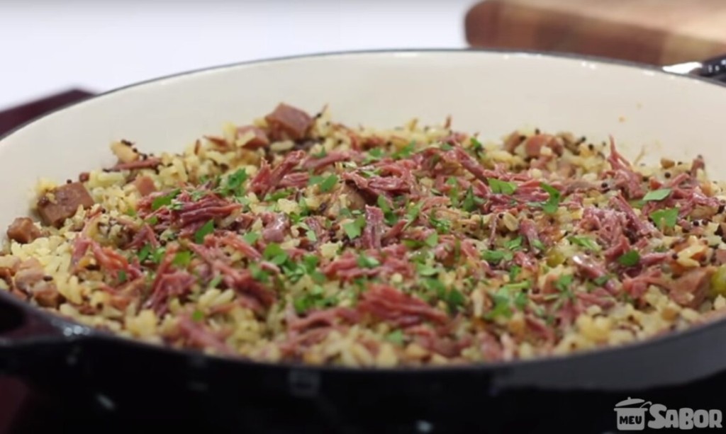 - Após cozido, finalize com um pouco de carne seca e salsinha.