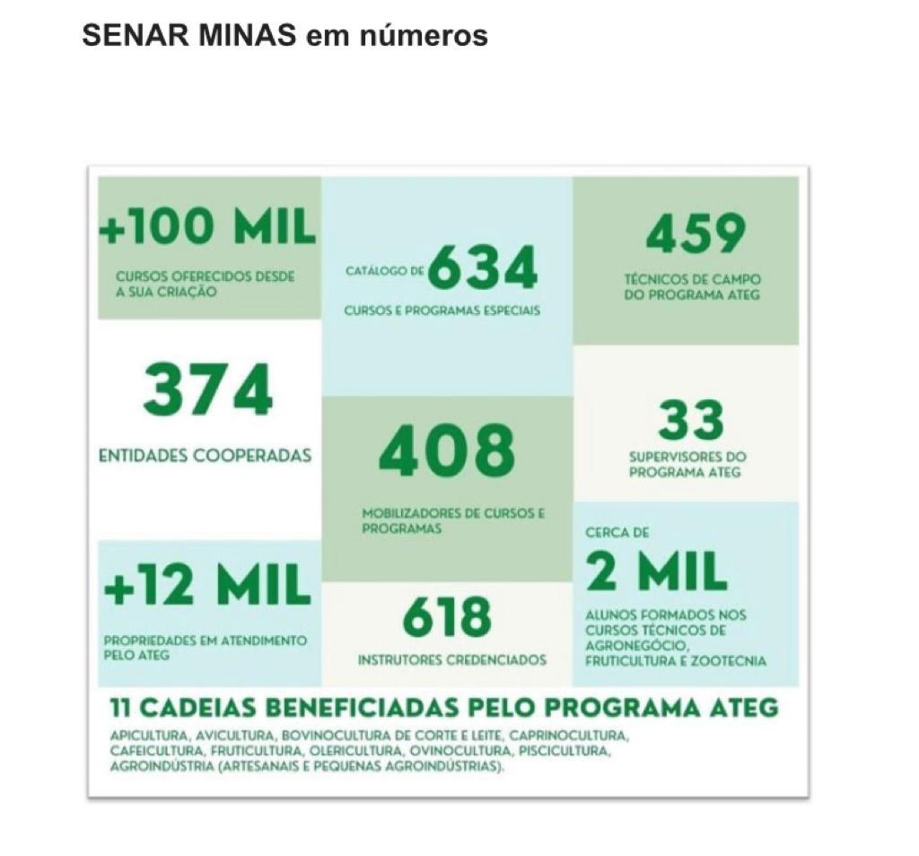 Neste 7 de abril, o agro mineiro comemora mais um aniversário do SENAR MINAS (Serviço Nacional de Aprendizagem Rural). São 29 anos levando cursos e programas para produtores e trabalhadores rurais e seus familiares. Mais de um milhão de pessoas já participaram dos treinamentos de Formação Profissional Rural e Promoção Social e de projetos como o Programa de Assistência Técnica e Gerencial (ATeG). Mais de 12 mil propriedades rurais atendidas só neste ano, por meio de 459 técnicos de campo e 33 supervisores. Outro destaque é o Centro de Excelência em Cafeicultura, que está sendo construído em Varginha e, em 2023, deverá capacitar até 300 alunos, simultaneamente.