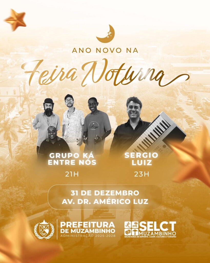 A chegada do Ano Novo em Muzambinho será marcada por música, encontro e celebração com o Show da Virada, que acontece no dia 31 de dezembro, durante a tradicional Feira Noturna, na Avenida Dr. Américo Luz. A programação especial integra as ações culturais de fim de ano promovidas pelo município e promete reunir famílias, amigos e visitantes para celebrar a virada com alegria e esperança.