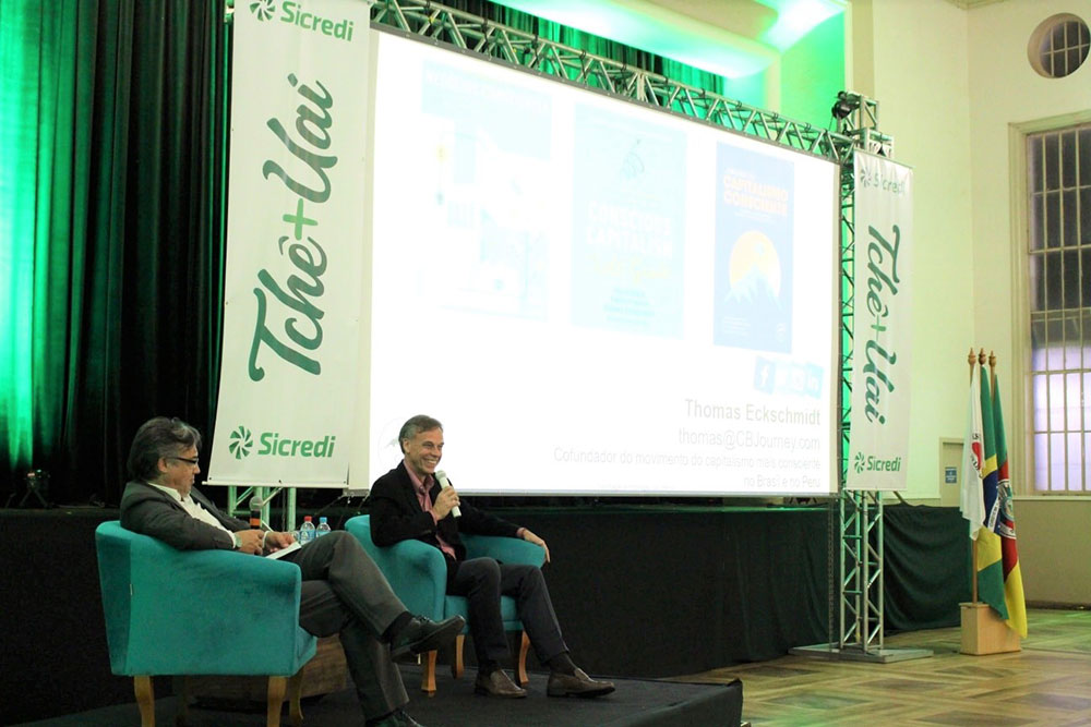 Os coordenadores de núcleo que estiveram presentes na assembleia também participaram de um momento de valorização das culturas que permeiam a cooperativa. O “Tchê+Uai”, representação das culturas gaúcha e mineira que hoje compõem a área de atuação da cooperativa, somaram-se às etnias que representam o município de Ijuí/RS. Com recepção da dupla Vinicius e Rene, que apresentaram músicas tradicionalistas gaúchas e apresentação de grupos de dança étnicas Alemã e Árabe, a noite também contou com a presença dos coordenadores de núcleo das agências de Minas Gerais, que pela primeira vez participaram de agenda em solo gaúcho. O encerramento da noite ficou por conta de Thomas Eckschimidt, com a palestra “Despertar o Espirito Heroico do Cooperativismo”. Thomas é um entusiasta do capitalismo consciente, fundador do movimento capitalismo mais consciente no Brasil e no Peru, CEO da maior rede de consultores de capitalismo consciente no mundo.
