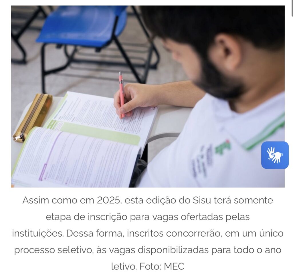 Assim como em 2025, esta edição do Sisu terá somente uma etapa de inscrição para as vagas ofertadas pelas instituições participantes. Dessa forma, os inscritos concorrerão, em um único processo seletivo, às vagas disponibilizadas para todo o ano letivo. O resultado da única chamada regular será divulgado no dia 29 de janeiro de 2026. Todos os estudantes selecionados dentro das vagas disponíveis, tanto na chamada regular quanto por meio da lista de espera, deverão realizar a matrícula na instituição no período indicado no edital.