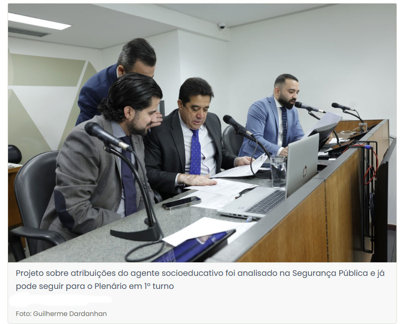Em reunião na terça-feira (14/10/25), a Comissão de Segurança Pública da Assembleia Legislativa de Minas Gerais (ALMG) sugeriu novo texto ao Projeto de Lei (PL) 4.330/25, o qual inclui, entre atribuições do agente de segurança socioeducativo, executar, preferencialmente, escolta, transporte ou condução de adolescente infrator em compartimento fechado de veículo policial que não atente contra sua dignidade ou integridade física ou mental.