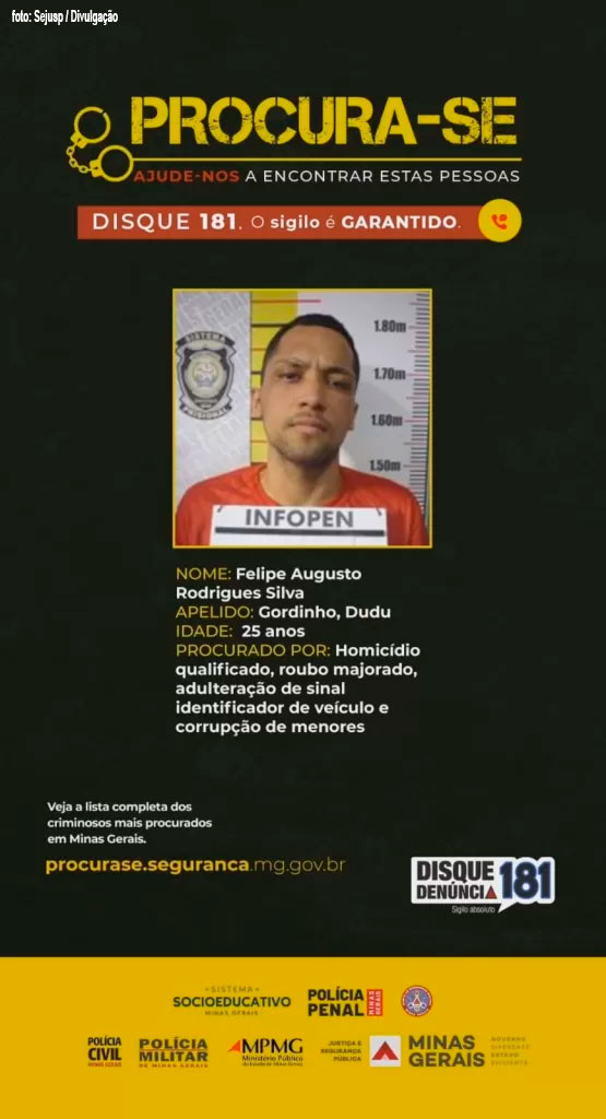 O Procura-se é coordenado pela Sejusp em parceria com a Polícia Civil, a Polícia Militar, o Corpo de Bombeiros Militar, a Polícia Penal, o Sistema Socioeducativo, o Ministério Público e o Tribunal de Justiça de Minas Gerais (TJMG), e tem como objetivo realizar a prisão de indivíduos foragidos da Justiça, a partir de ações qualificadas das polícias, das Agências de Inteligência e da participação do cidadão, por meio de denúncias ao Disque Denúncia Unificado 181. Para saber mais sobre os alvos acesse procurase.seguranca.mg.gov.br.